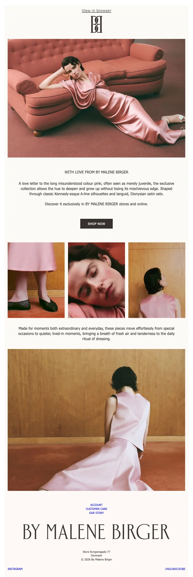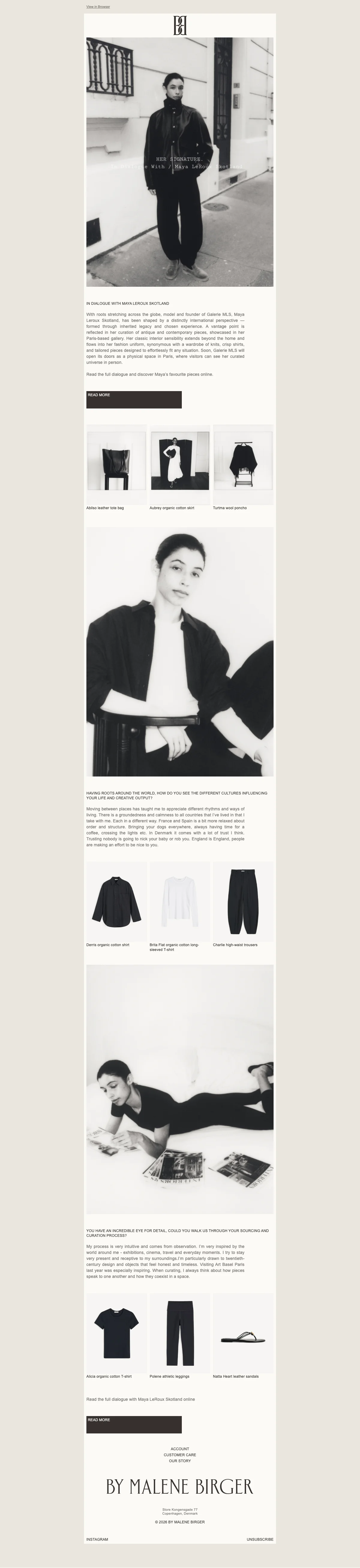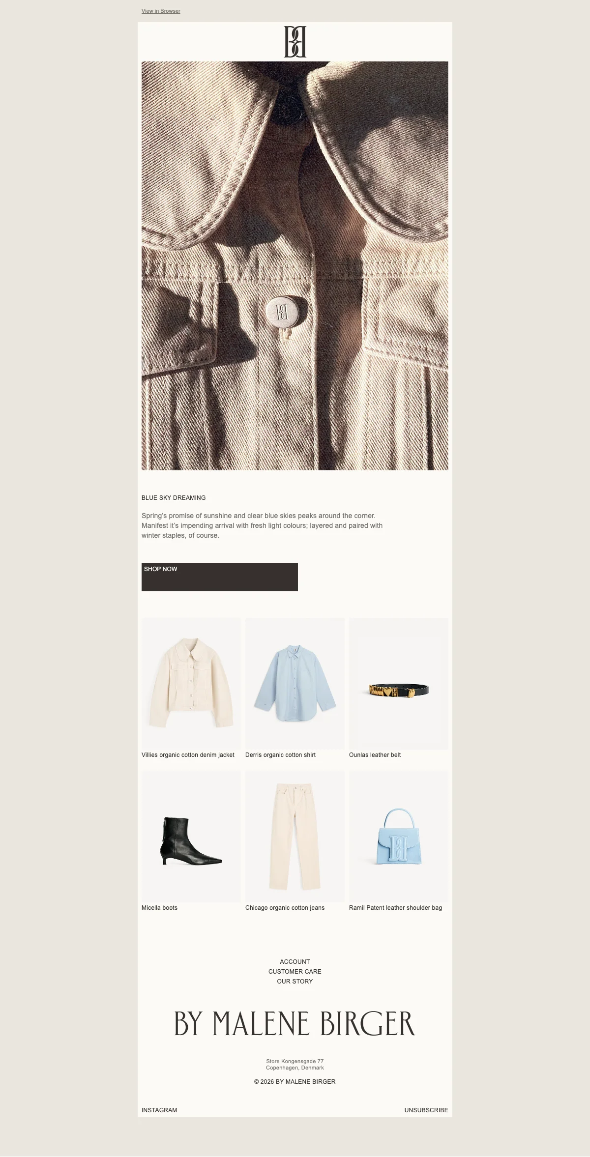 På By Malene Birger säljer de kläder som är både lyxiga och prisvärda. I butiken kan du till exempel shoppa kläder som klänning, skjorta, linne, t-shirt, kofta, blazer, kappa och jacka, jumpsuit, byxa, kjol och underkläder för dam. Priset är högre än för du hittar i en vanlig butikskedja men lågt jämfört med andra kända designmärken. Därför kan du shoppa mode som de flesta har råd med, och plagg som går att bära länge.