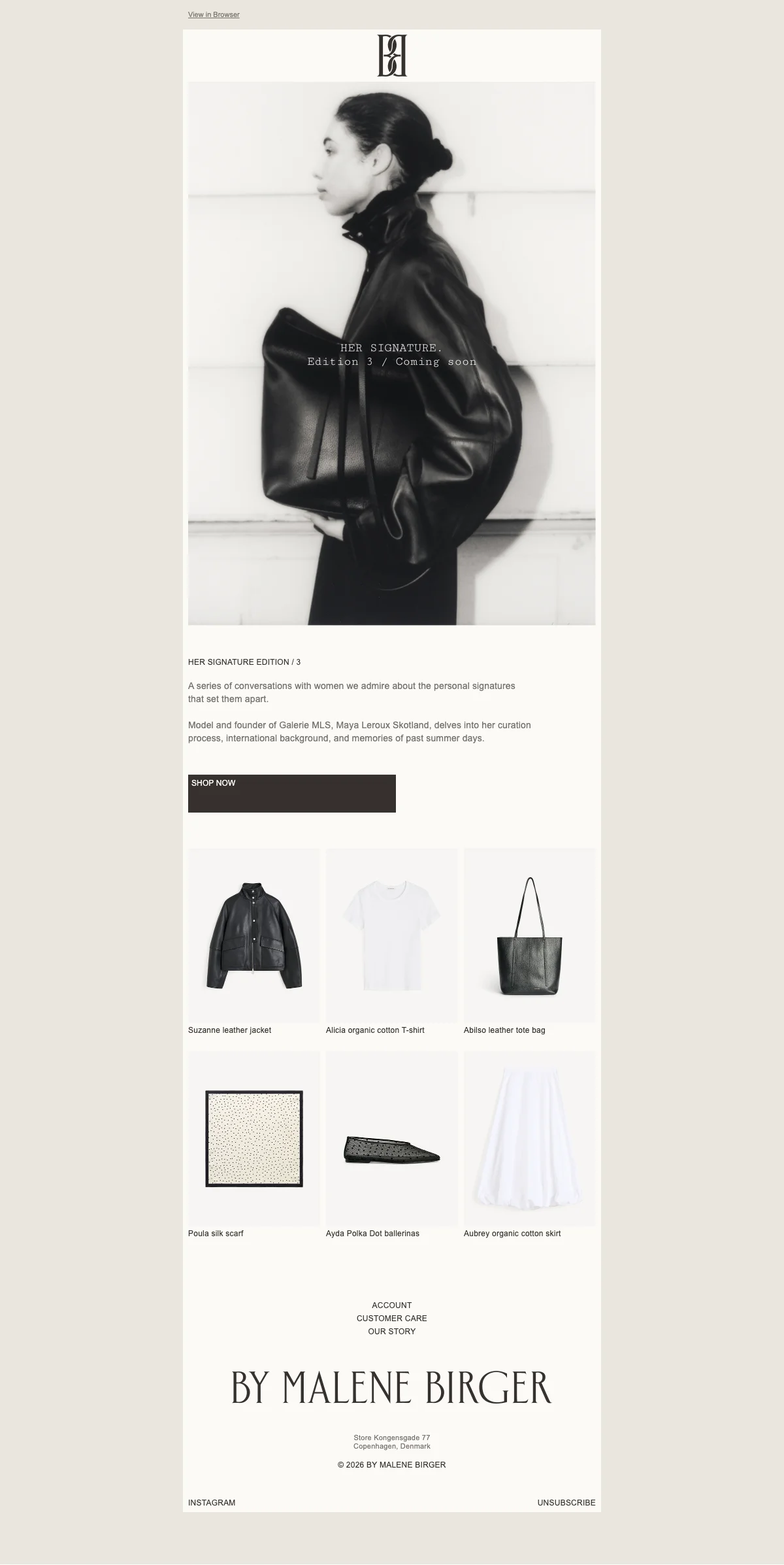 Malene Birger är en dansk designer som grundade märket By Malene Birger år 2003. Märket By Malene Birger är väldigt populärt och de har en fokus på trendigt mode och lyx som människor har råd med. I By Malene Birgers butik online kan du shoppa kläder, väskor, skor och accessoarer av hög kvalité och som är stilrena och enkla att bära. De erbjuder kläder för dam och som finns i storlekarna XXS - XL. När du handlar kläder, väskor, skor eller accessoarer kan du använda en rabattkod. Med hjälp av en rabattkod får du ner dina kostnader och du kan shoppa lyxigt mode till ett lägre pris. På Saleduck listar vi också olika aktuella erbjudanden och reor på varor från Malene Birger som kan vara bra att känna till.