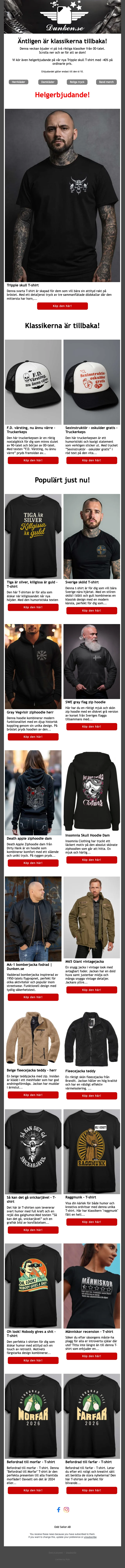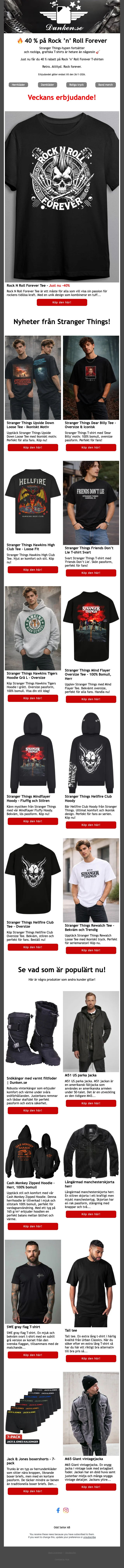 Dunken är en butik på nätet som säljer ett stort utbud av kläder i en rockig stil. Där har du tuffa kläder för damer, herrar och barn och du kan alltså klä hela familjen som rockstjärnor. Till exempel kan du shoppa olika skor, rockabilly kläder, slitna jeans och andra kläder online i butiken och du kan använda en rabattkod när du gör det. Andra populära plagg som webshoppen säljer är plagg med dödskalle, bomberjacka och baddräkt.