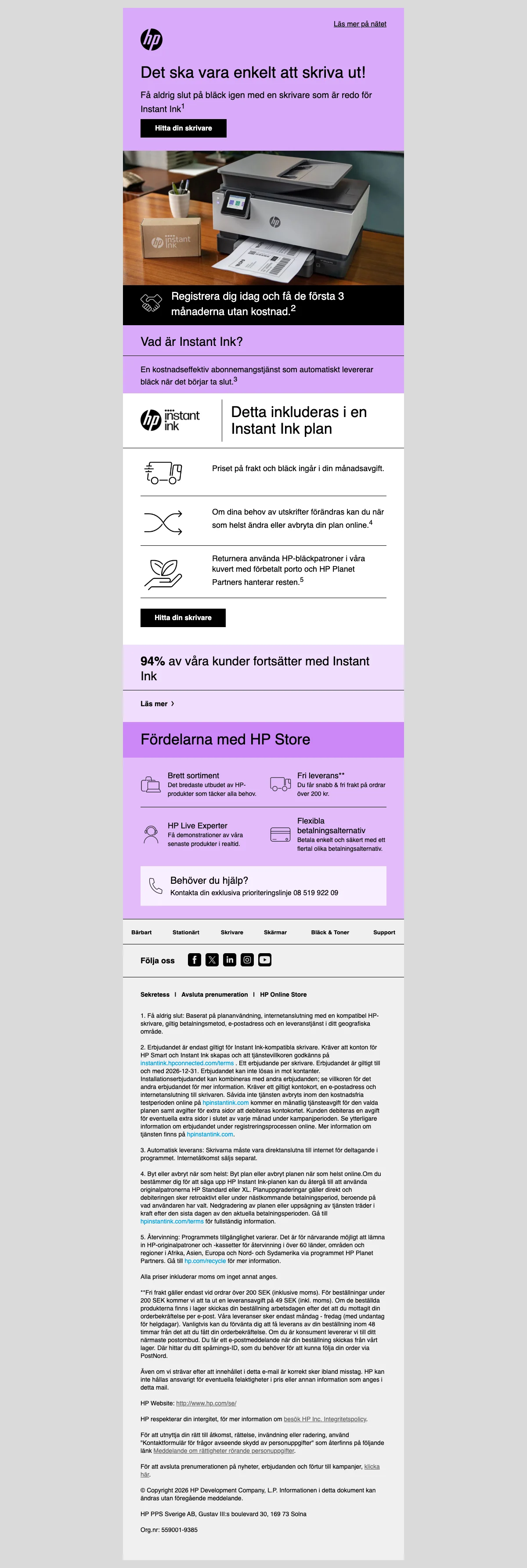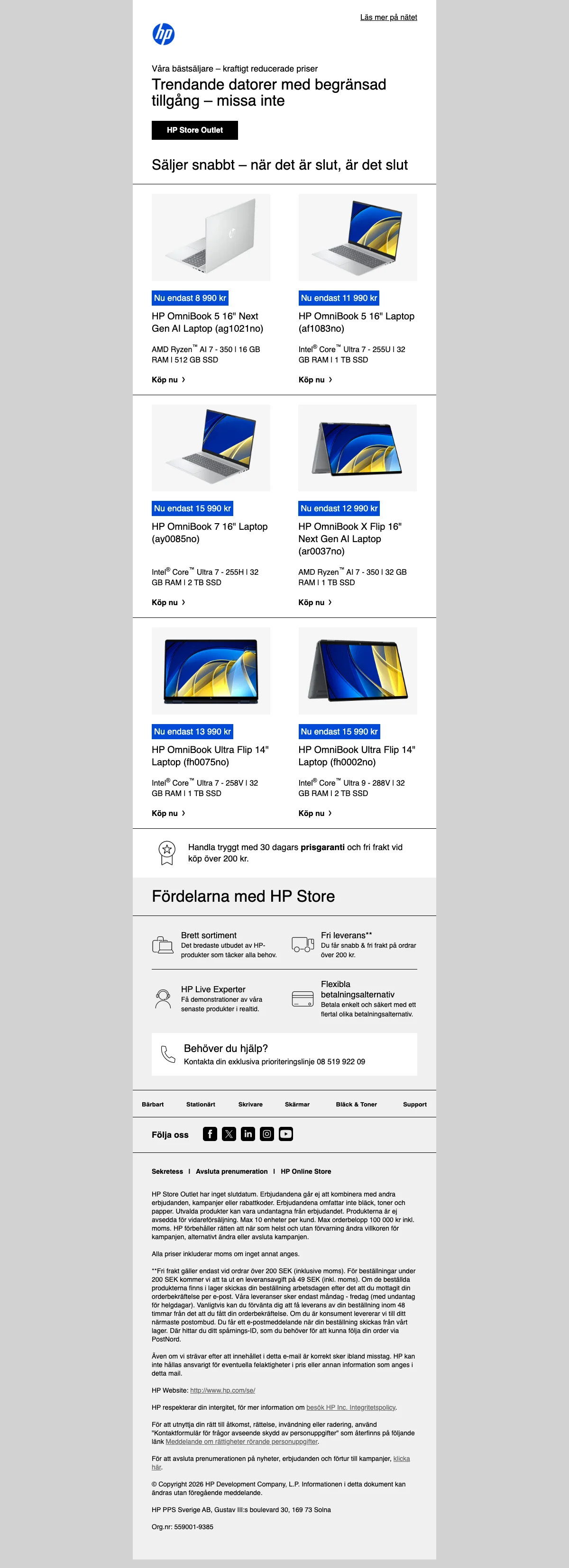 Hewlett Packard's egen webbutik, HP Store Sverige, är till för dig som behöver bärbara datorer, surfplattor, stationära datorer, skrivare, bläck & toner, bildskärmar samt tillbehör. Företagets teknik gör det enklare för dig som konsument eller företagskund världen över. Du hittar allt från den senaste tekniken och nyheterna till prisvärda produkter och artiklar. Oavsett om du vill hålla dig uppdaterad med de senaste produkt-släppen eller fynda en utgående artikel är du på rätt plats om du gillar teknik.
