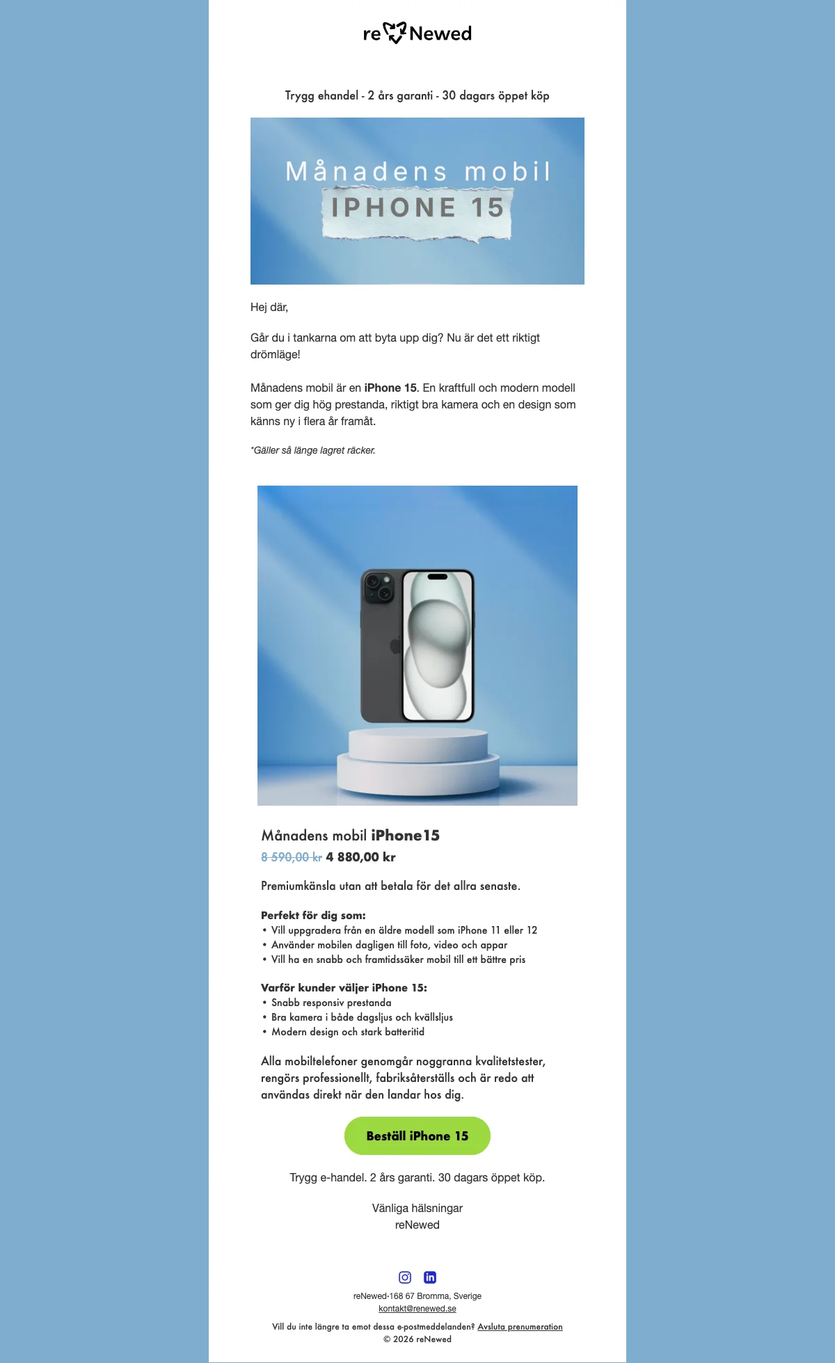 ReNewed iPhone 15 månadens mobil — kampanjpris 4 880 kr med garanti